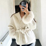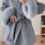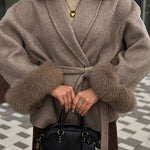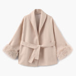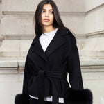 Belted Wool-Blend Coat with Faux Fur Cuffs – Women’s Elegant Outerwear
